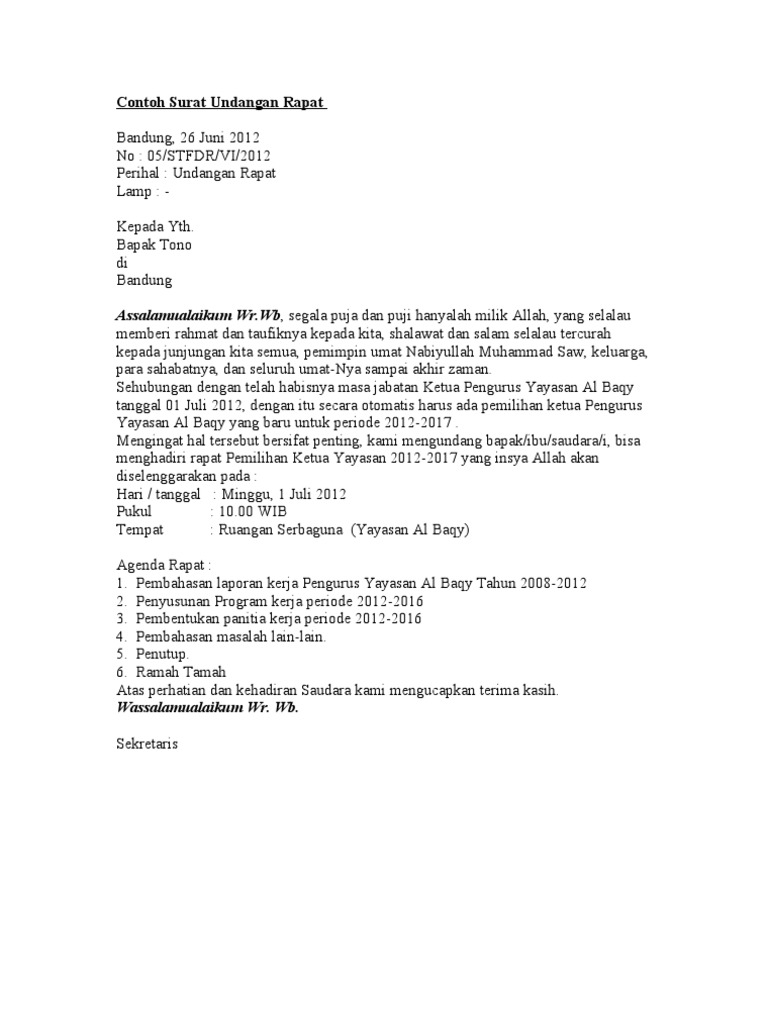 Contoh Surat Undangan Rapat Yayasan Doc / Download 11 Contoh Surat Undangan Resmi dan Tidak DOC - Contoh surat undangan rapat biasanya masuk dalam jenis ini.. Surat resmi memiliki kaidah penyusunan khusus yang bersifat formal. Download undangan remaja masjid format doc unduh contoh undangan irma format pdf. Ada berbagai contoh surat undangan dengan berbagai jenis kegiatan seperti surat undangan rapat, pernikahan, reuni, dan sebagainya. Contoh surat rapat kepala sekolah. Dalam pelaksanaan suatu kegiatan rapat, kita tidak bisa begitu saja mengadakannya tanpa suatu.